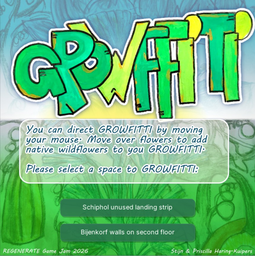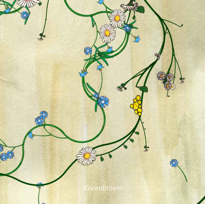 Stijn started building the basic interaction of growing something over your screen and I created a storyboard / screens overview. We discussed options for interaction and settled on following the mouse to direct growth and popping up flowers in screen that the player could grow over to select. Stijn continued working on the growing interaction and built a flower editor that I filled with assets of various common Dutch wildflowers: Madelief (daisy) Boerenwormkruid (tansy) Korenbloem (corn flower) and Amandelwolfsmelk (wood spurge). I painted everything on paper and we digitized these into the game. Sadly we did not have enough time to make the picture-taking play mode so we are left with the zen of endless growing.